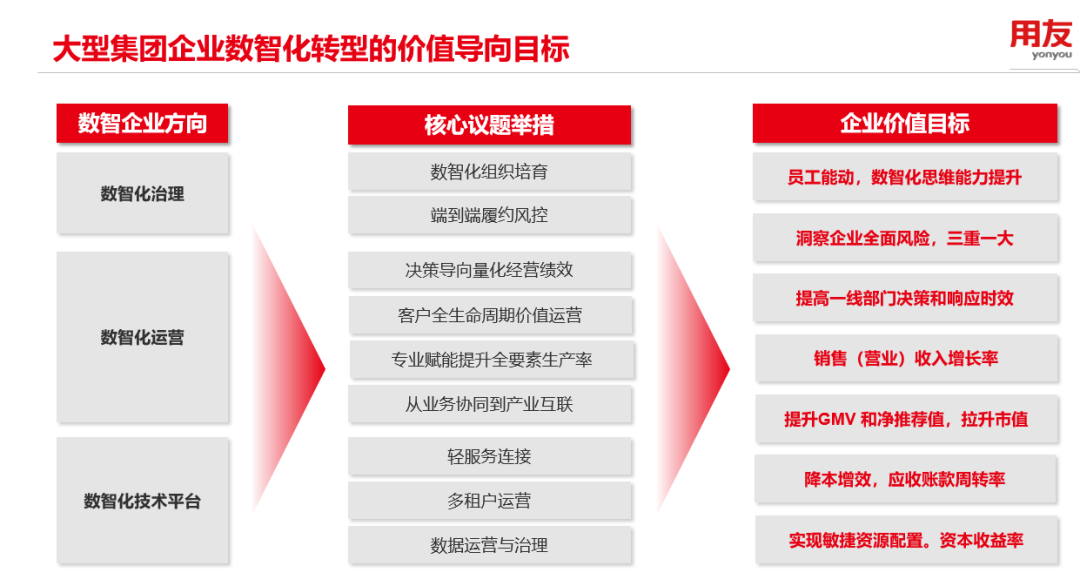 用友認(rèn)為,大型企業(yè)在需求重塑、產(chǎn)業(yè)調(diào)整、政策升級(jí)等多重變革力量交織下,數(shù)智化轉(zhuǎn)型難度與日俱增。對(duì)于這項(xiàng)復(fù)雜而漫長(zhǎng)的工作來(lái)說,明確價(jià)值導(dǎo)向?qū)⒅破髽I(yè)拾級(jí)而上。